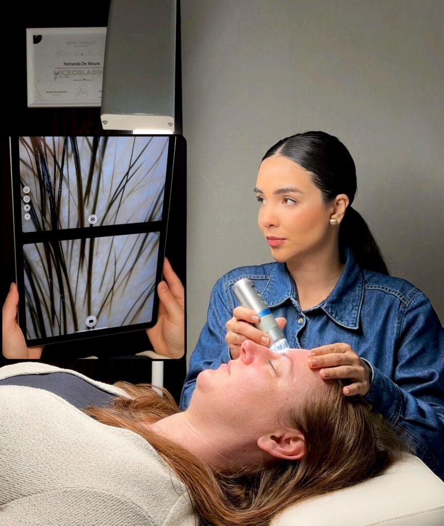 The way each person responds to this protocol can vary, since eyebrow thinning and loss of density are often related not only to aging, but also to habits like excessive plucking. Through microscopic evaluation, we can analyze the skin and hair follicles in detail, checking for active capillaries in more complex cases. This tool also supports us in guiding possible diagnoses and recommending the most effective home care routine.